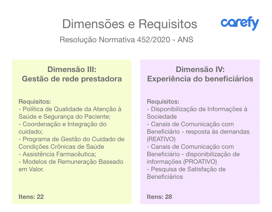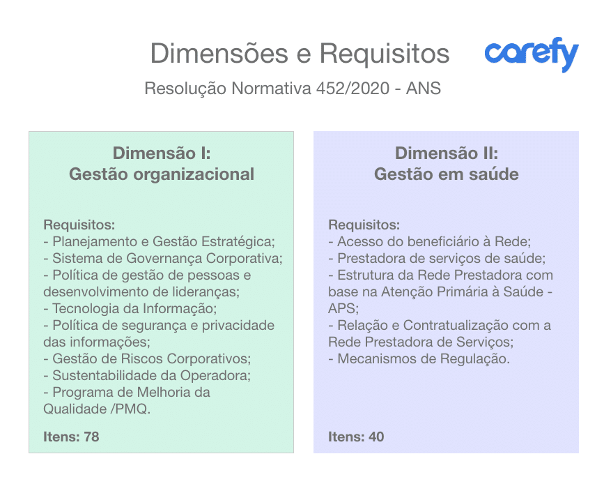 Os requisitos foram adequados de acordo com as esferas denominadas dimensão. Em suma, mantiveram-se alguns dos requisitos da RN 277, porém, houve a adequação de antigos e/ou inclusão de novos.